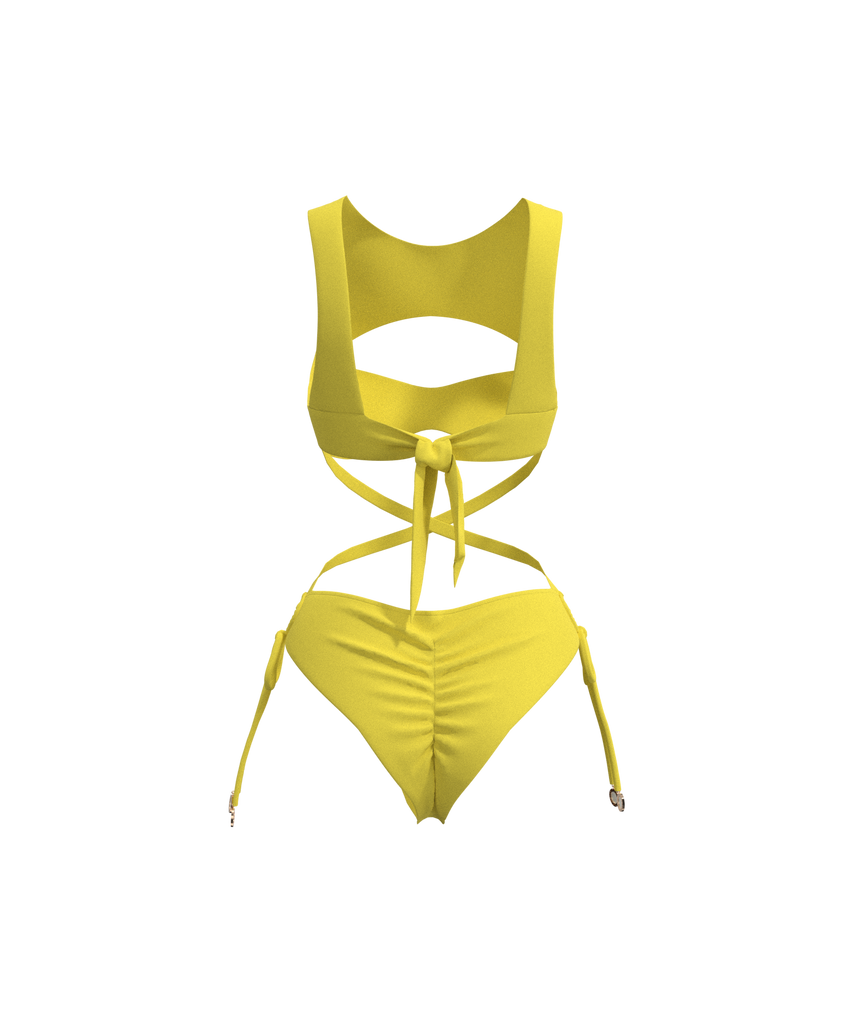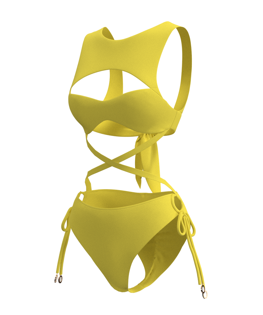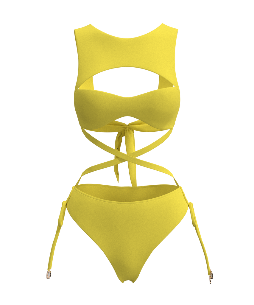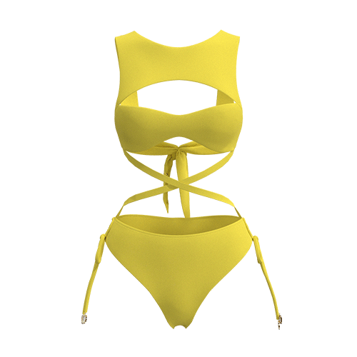 My Main Squeeze is a unique one piece that almost resembles a two-piece leaves little to the imagination with intricate and sexy ties allowing you to bare a whole lot of sexiness, while flattering and accentuating the waist and butt, and carefully minimizing the bust area. The bust area is well supported like a sports bra with a high neckline and cheeky cutout. The backless design also allows the tie to be adjusted to the desirable support.